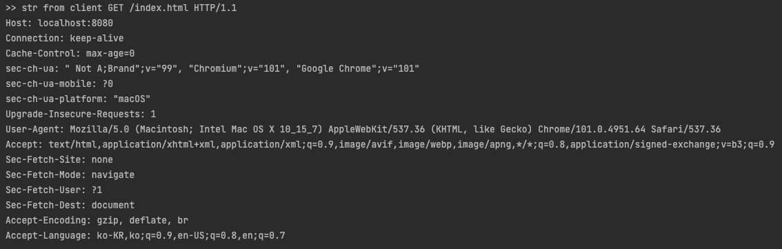 파일의 경로를 찾기 위해서 http 메시지 시작줄의 http 메서드(GET) / URL 등의 요청 타겟(/index.html) / http 버전(HTTP/1.1)에서 두번째를 정보를 가져와야 한다.
